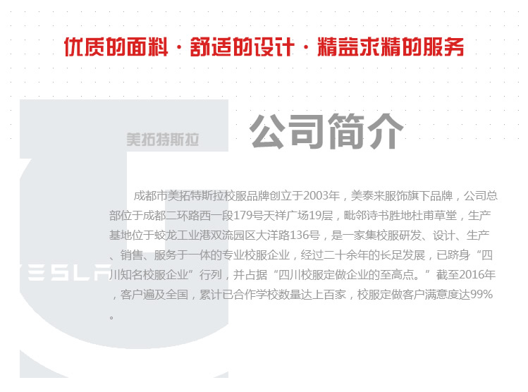 成都市美拓特斯拉服装在每个区域都设有服务部,规模较大的学校均设有服务中心。服务部、服务中心除了提供“售前、售中、售后”一站式全方位的服务外,每年还将专业的“美拓特斯拉校服售后服务专用车”开到学校,等于把工厂搬到学校。为学生提供免费维修服务,从而大幅度提升了学生和家长的满意度。